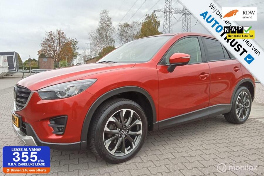 Uw nieuwe auto staat klaar voor vertrek. Stap gerust in, deze Mazda CX-5 heeft 125295 kilometer gelopen en is van het bouwjaar 2016. De aandrijving komt voor rekening van een benzinemotor en een automatische transmissie. Het lederen interieur voegt stijl en allure toe. Deze Mazda CX-5 heeft verwarmbare voorstoelen, voor zowel bestuurder als bijrijder. Wat een licht geeft dat glazen elektrisch bedienbare shuifdak. In deze auto profiteert u onder andere ook van: 19 inch lichtmetalen velgen, LED koplampen, donker getint glas achter, in delen neerklapbare achterbank, LED-achterlichten en verstelbare lendensteunen.